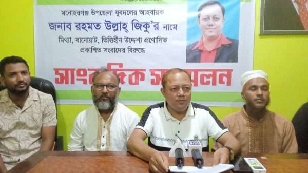 চাঁদা দাবির মিথ্যা মামলা এবং বিভিন্ন গণমাধ্যমে মিথ্যা মামলার উদ্বৃতি দিয়ে সংবাদ প্রকাশের প্রতিবাদে সংবাদ সম্মেলন করেছেন কুমিল্লার মনোহরগঞ্জ উপজেলা যুবদলের আহ্বায়ক রহমত উল্লাহ জিকু। শনিবার বিকেলে উপজেলা সদরে একটি হলরুমে অনুষ্ঠিত সংবাদ সম্মেলনে যুবদলের আহ্বায়ক রহমত উল্লাহ জিকু তার লিখিত বক্তব্যে বলেন- প্রিয় সাংবাদিক বন্ধুরা গত বৃহস্পতিবার দৈনিক আমার দেশসহ কয়েকটি অনলাইন পোর্টালে আমার বিরুদ্ধে একটি সংবাদ প্রকাশ করে যা আমার দৃষ্টি গোচর হয়। আমরা জানি সাংবাদিকরা হচ্ছেন জাতির বিবেক এবং আমার ভাষায় একজন নিরীক্ষক, সে নিরীক্ষকদের কাছে দেশের জনসাধারণ সুস্থ, সত্য সঠিক সংবাদ সবসময় আশা করে থাকে কিন্তু সঠিক তথ্য বিশ্লেষণ না করে কাউকে হেয় প্রতিপন্ন করার আশায় কোনো সংবাদ প্রচার করা মোটেই সমীচীন নয়। যে ব্যক্তিটি আমার বিরুদ্ধে চাঁদাবাজির মামলা করে তাকে ব্যক্তিগতভাবে কখনোই চিনতামনা কিন্তু বিগত কয়েকমাস আগে মামলার ১নং আসামি আবু বকর সিদ্দিক আলমগীর আমার চাচাতো ভাইয়ের শ্বশুর আমাকে ফোনে জানান, একজন ব্যক্তির সাথে ওনাদের জায়গা সংক্রান্ত বিরোধ চলে। বিষয়টি সমাধানের জন্য আমার সহযোগিতা কামনা করেন।
